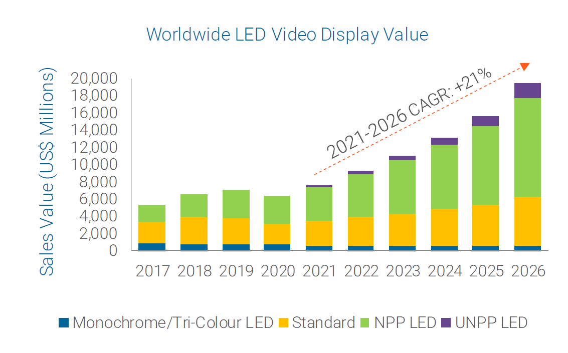 全球LED显示行业正走出新冠疫情的阴霾,于2021开始全面复苏。Futuresource报告显示,2021年全球LED显示市场总额达到76亿美元,较2020年同比增长19%。预计2022年全球LED市场规模将达到94亿美元,或同比增长22%。Futuresource预测,到2026年,该市场规模将达到195亿美元,2021至2026年间的复合年增长率达21%。